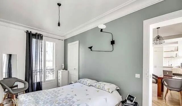 深色油漆最能强化床头主墙面的气场,也有把墙往后推的视觉效果。万一怕黑色太重太强烈,深灰、巧克力色、藏青色都是可替代的选项。