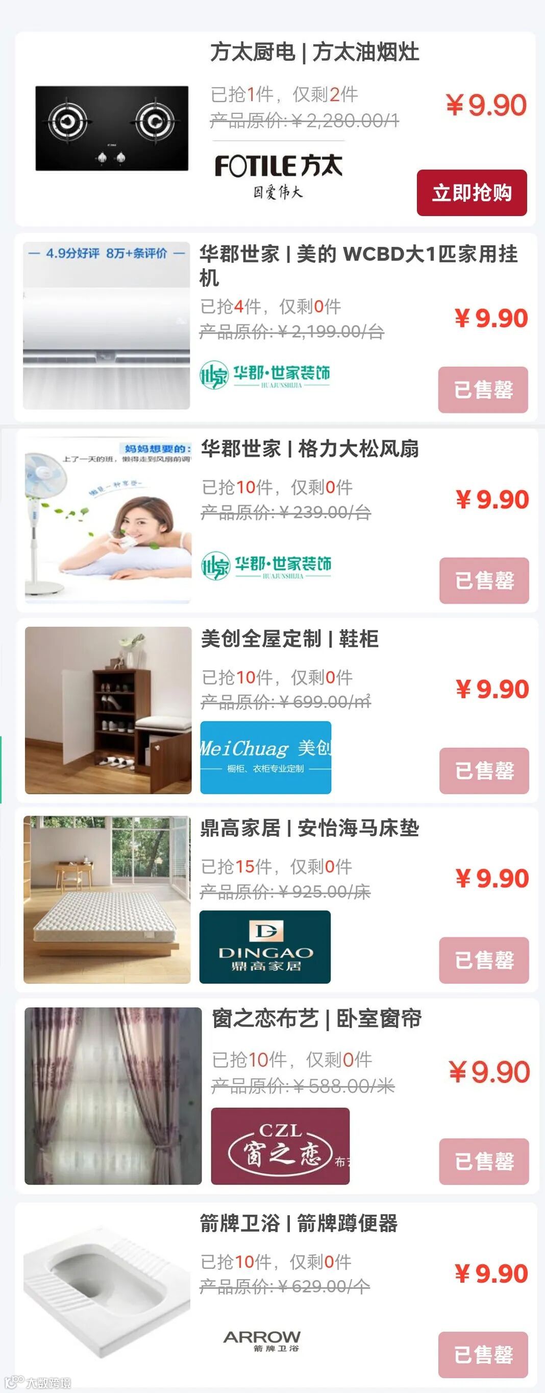 活动期间推出的全场9.9元商品秒杀活动,备受桂林业主好评,品牌家电,软装,卫浴,辅材等30多款主材家电,9.9无捆绑直接带回家!