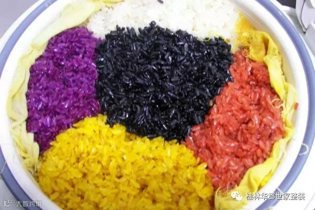 节前家家准备五色糯米饭和彩蛋。人们采来红兰草、黄饭花、枫叶、紫蕃藤、用这些植物的汁浸泡糯米,做成红、黄、黑、紫、白五色糯饭。相传,这种食品是深得仙女们的赞赏后流传下来的;也有人说是祭祀歌仙刘三姐的。吃了这种饭,人丁兴旺,身体健壮。彩蛋则是歌圩中男女青年用以交际传达情感的物品。壮家人喜爱五色饭,把它作为幸福吉祥的象征。除了农历三月初三外,社日、中元节,甚至过年等,也有人做五色糯米饭吃。在孩子满月、新居落成等喜庆日子里,也要蒸煮五色饭分送左邻右舍。壮人也爱枫叶,认为枫叶能“除邪驱鬼”,给人带来吉利和平安。所以,农历三月三做五色饭的时候,家家户户门口都插上一枝精心挑选的枫叶。甚至做五色饭的染料渣,也要撒在房屋外围的墙脚下,以求驱邪保平安。