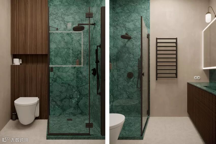 卫浴妆点绿色蛇纹大理石划分淋浴区,以细致纹理构筑沉稳气息。