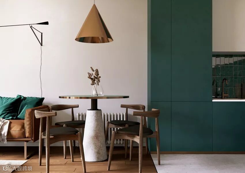 高高的绿色立柜,又成为了餐桌区完美的背景。