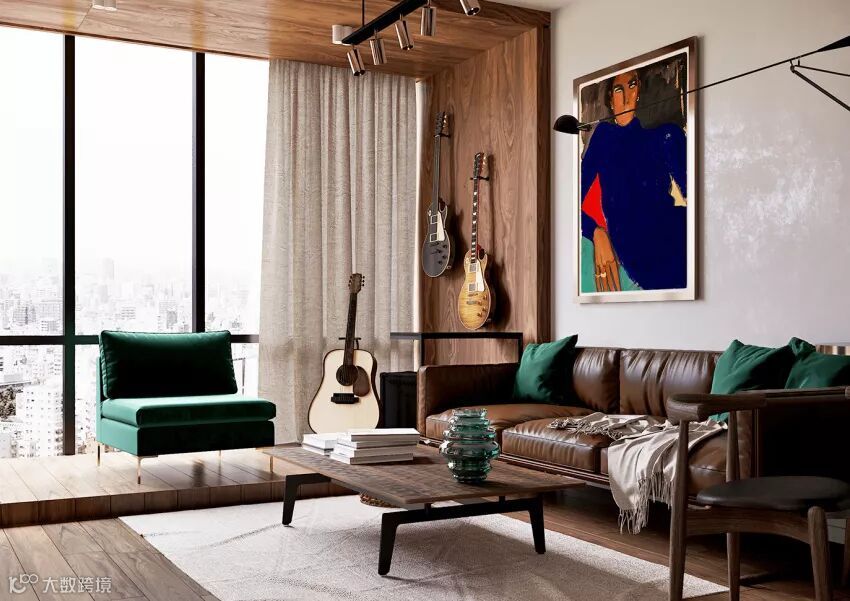 也许是设计师也发现了这个问题,特地用一块浅色地毯来阻隔一大片棕色。还好,绿色的单人沙发和抱枕挽救了该区域,让人们的视觉中心转移到亮色上。
