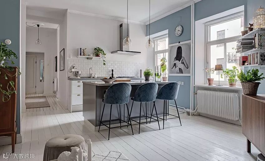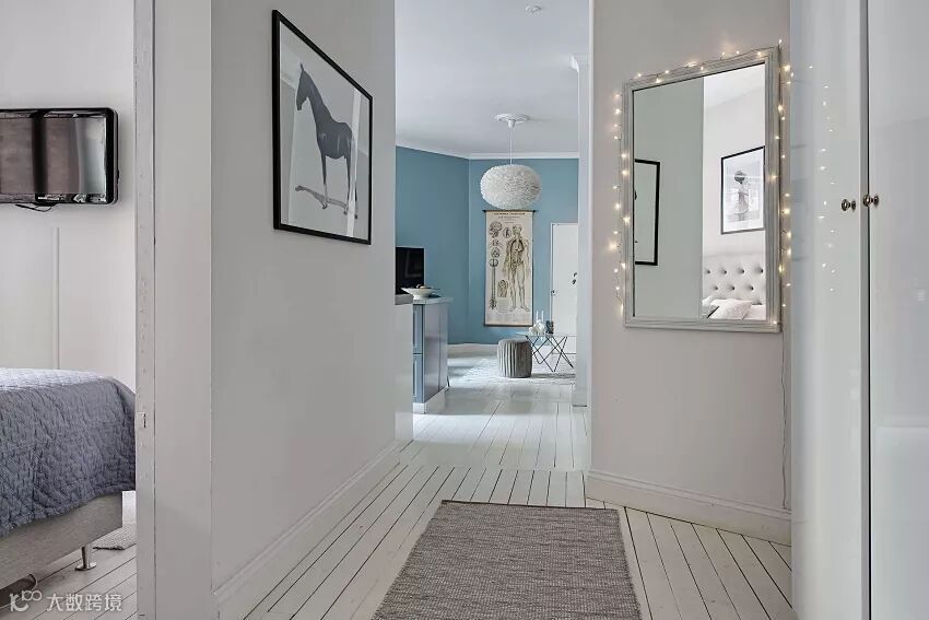 你会看到纯白+清新柔和的蓝色色调为基底的公共空间,这基本是用颜色来划分动区和静区了。