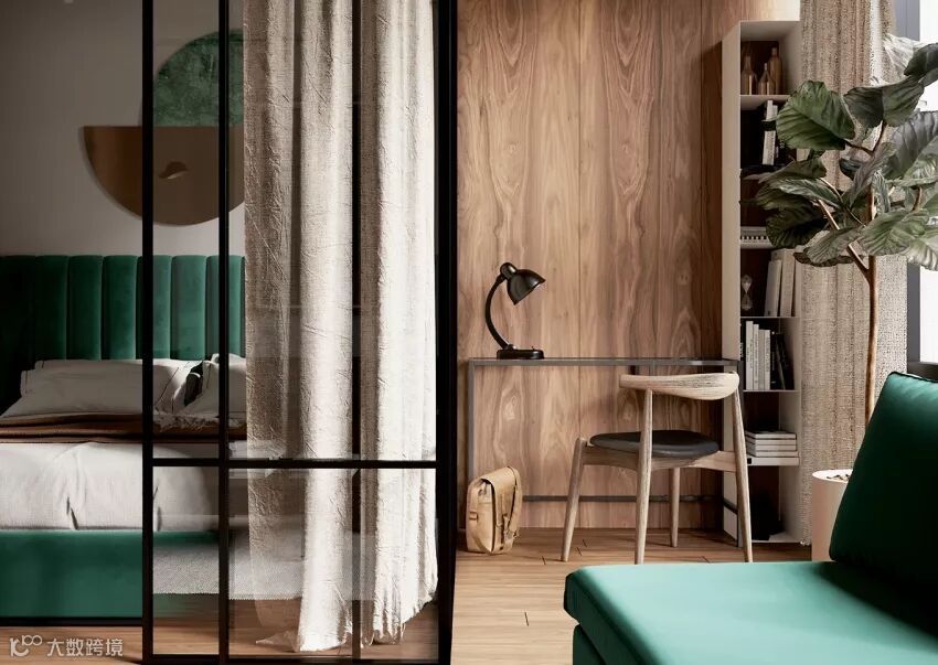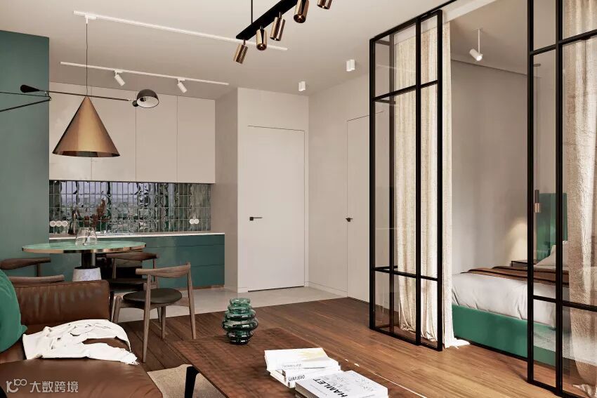 比如这套乌克兰室内设计事务所 RUDA Studio 为年轻夫妻设计的套房,就用森林绿、咖啡棕为主配色,藉由大理石餐桌、绒布床头、皮革沙发各种同的材质变化,来给空间营造更多可能性。