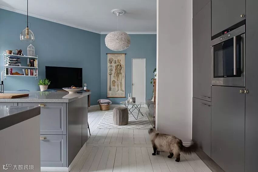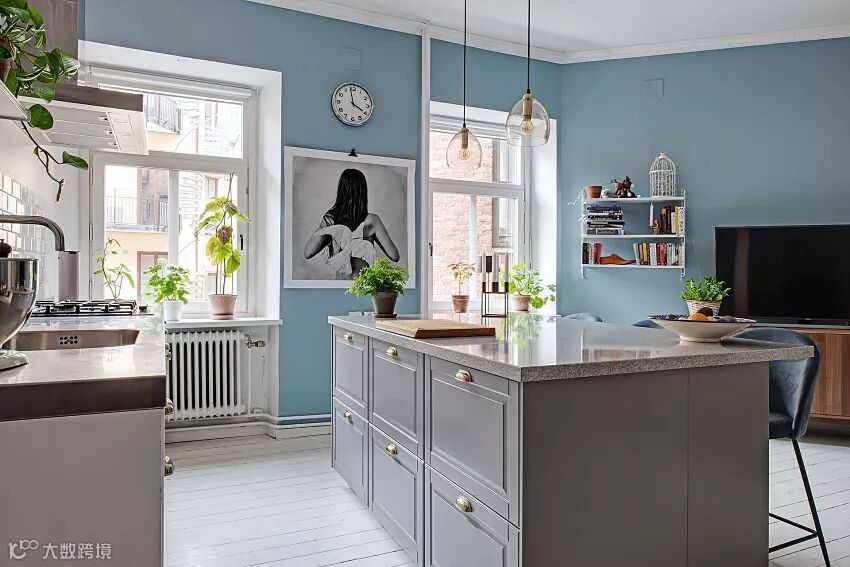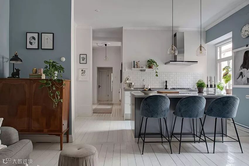其实可以放宽心。学学人家用一棕色的边柜,就综合了蓝色的冷峻感。
