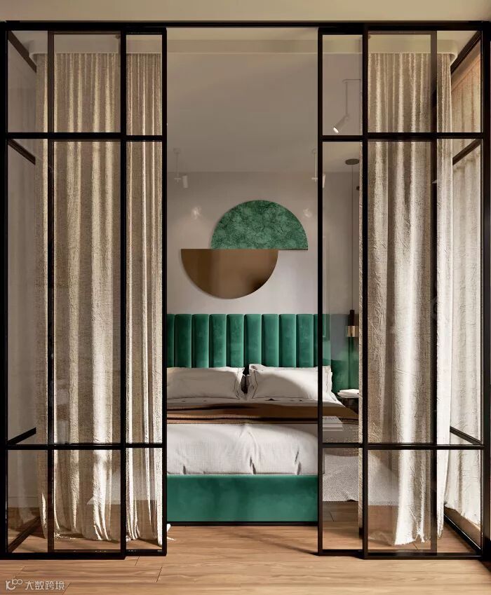 黑铁玻璃推门做为活动隔间,整体动线以开放格局导引窗外透亮光景。除了床头背景很吸引人,我更注意到窗帘盒的设置非常用心,给这个卧室盒子加分不少。