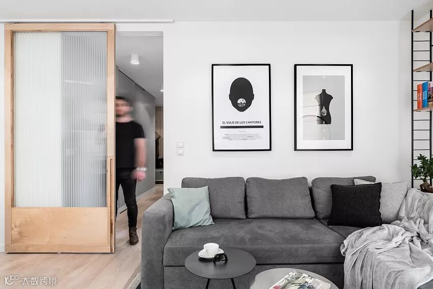 一扇磨砂玻璃木门,作为动静区的风格。透光不透隐私,是最理想的状态。