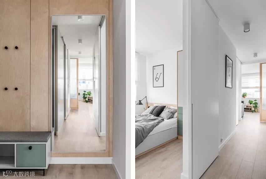 其他薄荷绿,分别点缀在静区中的衣柜和矮柜的抽屉面板上,合理又互相呼应,你能感受到全屋调性的统一。