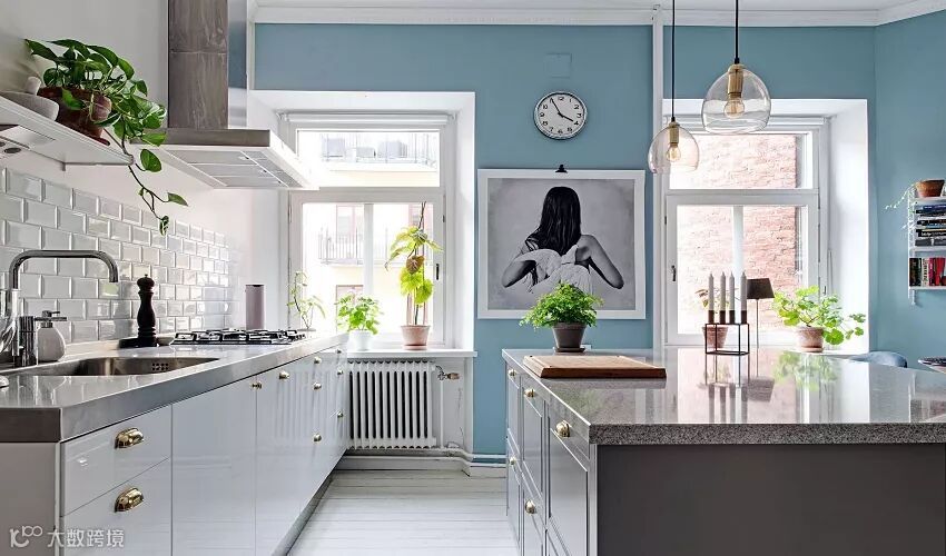 厨房的灯光运用也是如此,筒灯+吊灯增加了额外的情趣。