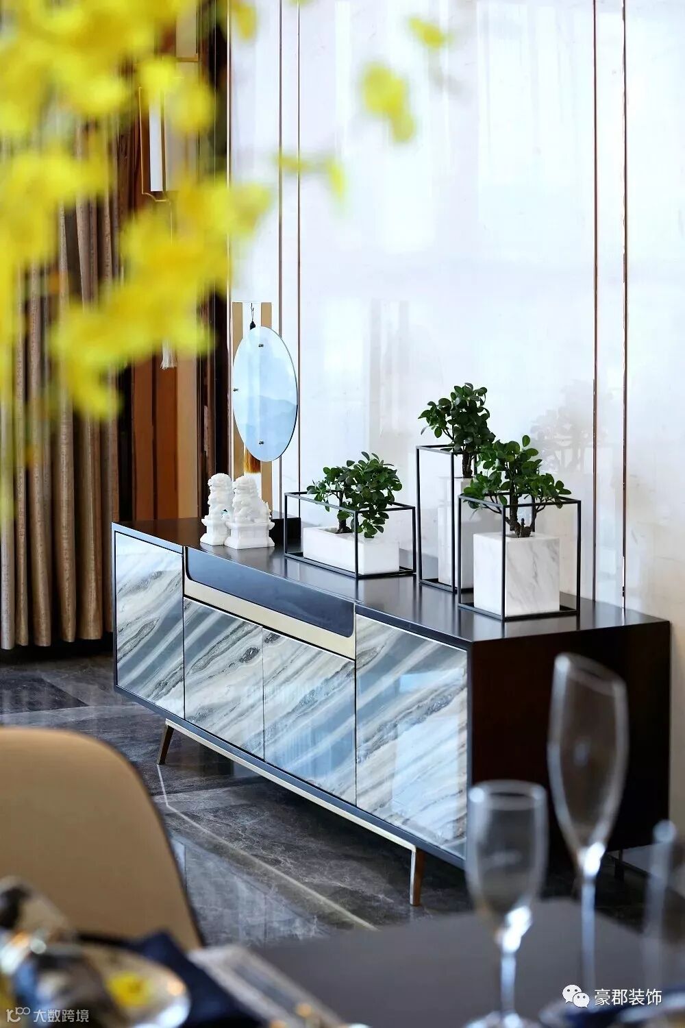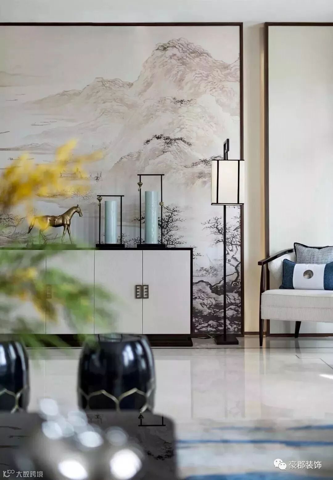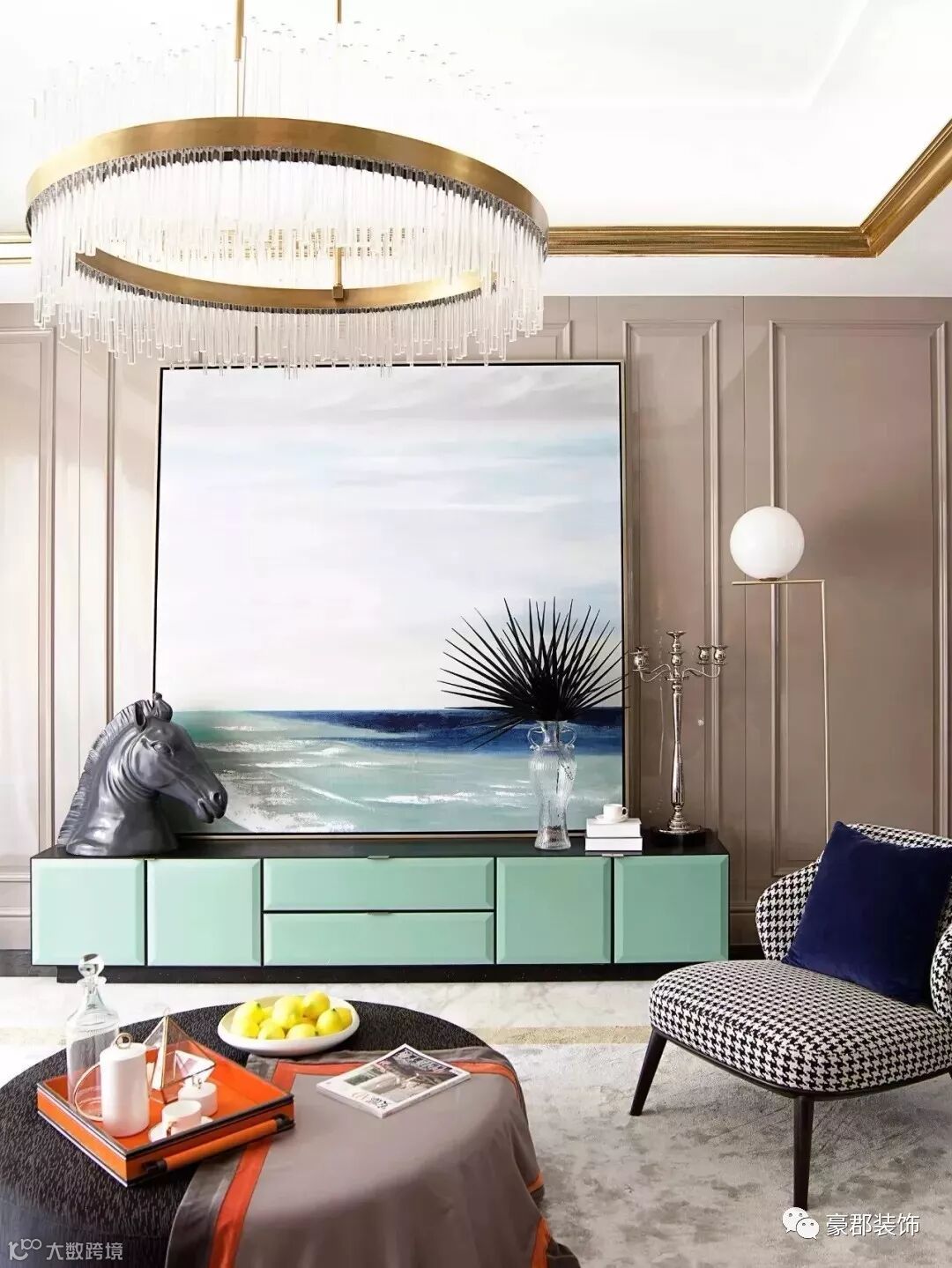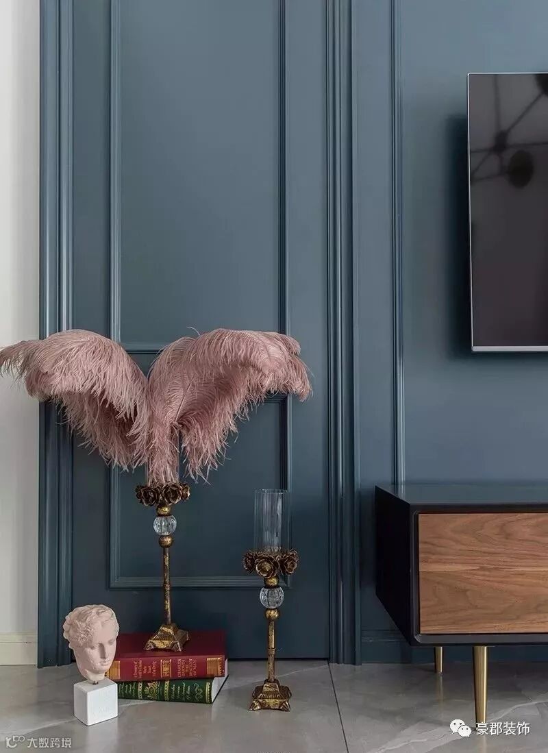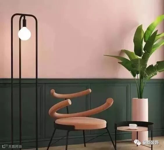 时下流行的“半墙主义”,刷一半、留一半的墙面也可以搭配细框线进行美化,再加上一些富有艺术感的装饰品凸显层次,让空间显得更有腔调和个性。