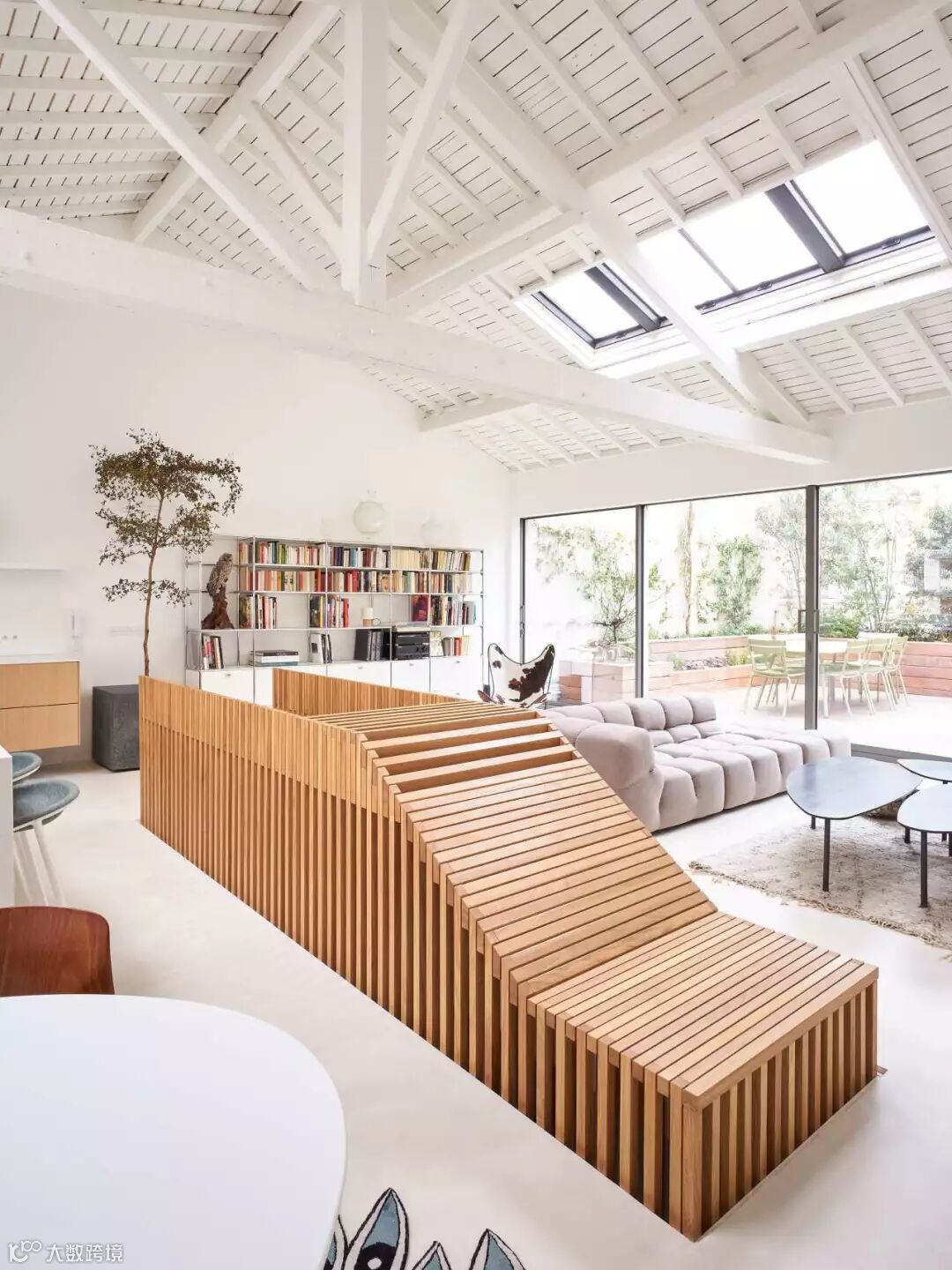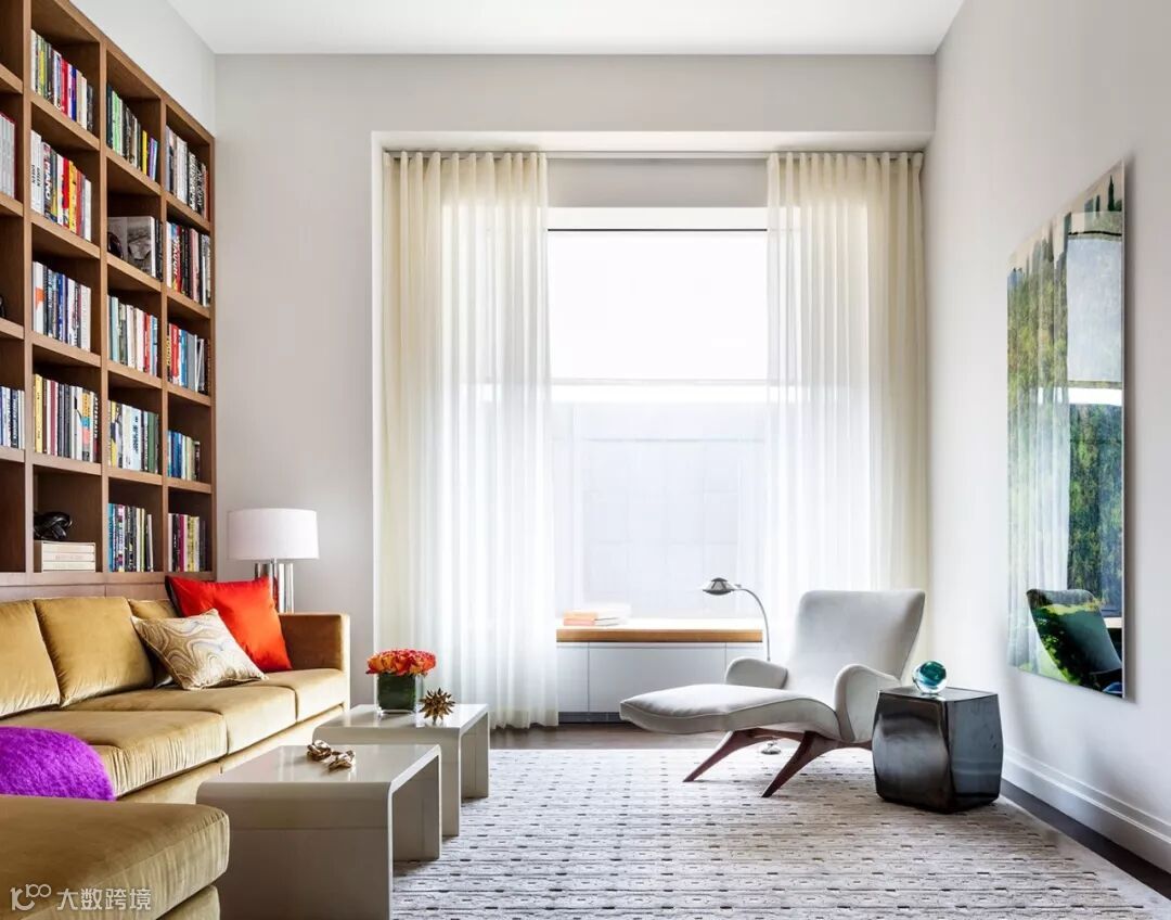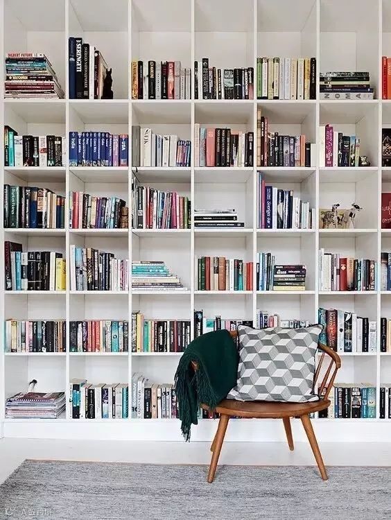 除了在原有功能区内增加书架,我们还可以利用书架创造出一个独立的小空间。利用书架作为隔断就是一个巧妙地思路,既能保留采光,还能增加收纳空间,让居住空间更有层次感。