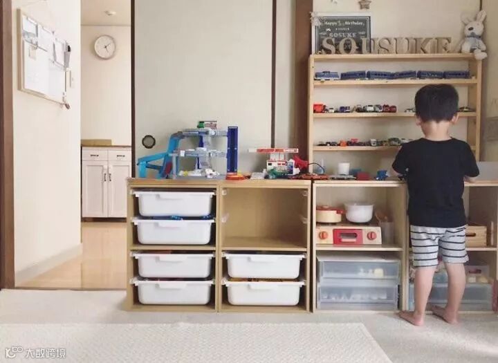 可以用收纳储物格DIY,更容易分类。孩子收放都很方便,而且还可以随着孩子的成长增加或者调整。