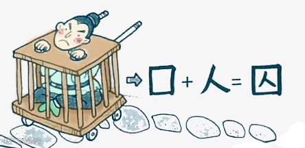 我们看一个“囚”字,人被酒色财气四堵墙团团围住,心在坐牢,被情枷爱锁捆绑住。