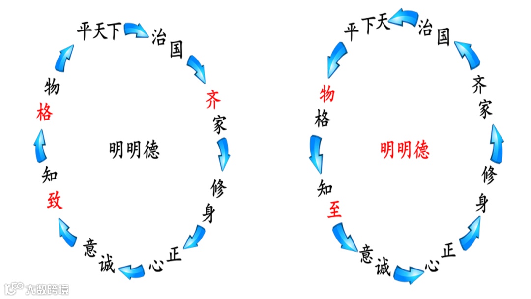《大学》云:“古之欲明明德于天下者,先治其国;欲治其国者,先齐其家;欲齐其家者,先修其身;欲修其身者,先正其心;欲正其心者,先诚其意;欲诚其意者,先致其知;致知在格物。物格而后知至,知至而后意诚,意诚而后心正,心正而后身修,身修而后家齐,家齐而后国治,国治而后天下平。”