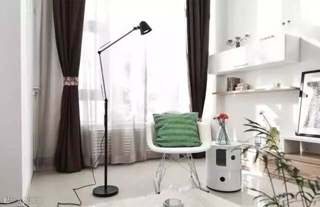 ▲ 靠近窗户的一角,被打造成了一方休闲空间。极简的落地灯,白色的单人座椅,白天借着窗外照进来的阳光阅读嬉戏,晚上打开灯,照样能做自己想做的事。