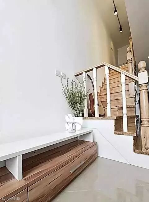 ▲ 楼梯和电视柜紧挨在一起,所以都统一使用了原木材料和白色,达到了室内色彩的和谐搭配。