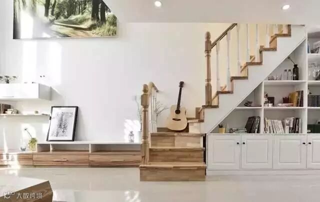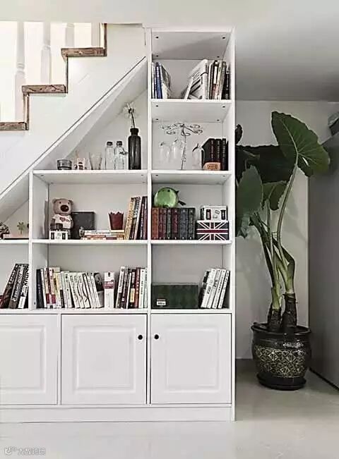 ▲ 楼梯下的空间也没被闲置,直接设计成了一排储物柜,用来摆放一些书籍和装饰品等等。