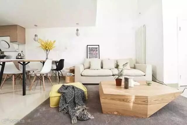 ▲ 整个客厅的色彩都以素雅为主。纯色的布艺沙发,舒服柔软;实木多边形不规则茶几,还能清晰的看见木材纹理,给室内增添了些自然与质感。