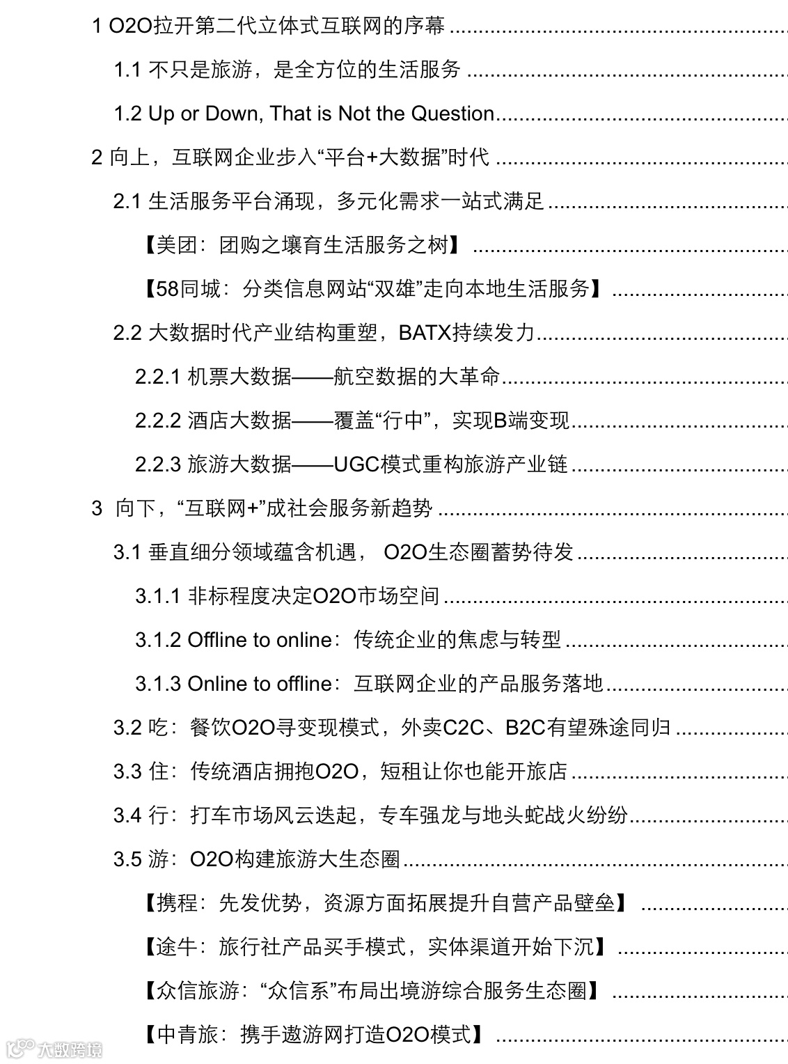 一站式生活服务平台提升单个用户价值,BATX行前、行中、行后大数据全覆盖。O2O向上演进的背景假设为:1.移动互联网时代,互联网企业赢家通吃,平台化公司通过跨界或延伸产业链,提升单个用户价值;2.大数据时代服务业信息化程度迅速提升,信息质量和效率的提升打破信息不对称瓶颈,企业核心优势从资源垄断转变为对消费者需求的理解,进而催生下游新需求。第一条假设催生了美团、58同城式本地化一站式生活服务平台。第二条假设下,BATX作为大数据开发急先锋,布局全面。我们对各个产品的大数据发展状况的总结如下:机票大数据发展较快,竞争格局也较为清晰;酒店大数据时代刚刚开始,鹿死谁手尚未可知;度假旅游行中数据(例如消费习惯、游玩时长等)采集难度更大,但伴随着移动端渗透率的上升、以及由此催生的各种商业模式的推陈出新,行业将会迎来大数据的春天。
