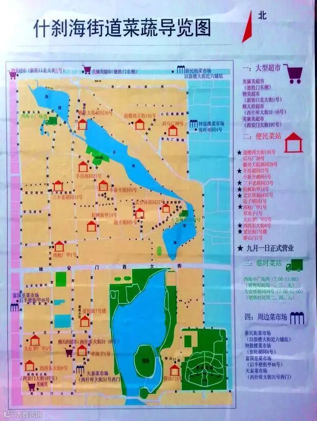 您可能还要问,菜市场升级换代之后,卖菜的比重毕竟变小了,面积不够用怎么办?没错,根据最新的《北京市居住公共服务设施配置指标》,社区菜市场建筑面积得达到每千人50平方米,如果面积不达标,我们还可以在街头巷尾布置更多分散的小菜站,这些菜站由政府减免摊位费,让居民能在家门口就买到便宜新鲜的蔬菜。您看,什刹海的便民菜站地图,是不是看着也不错。