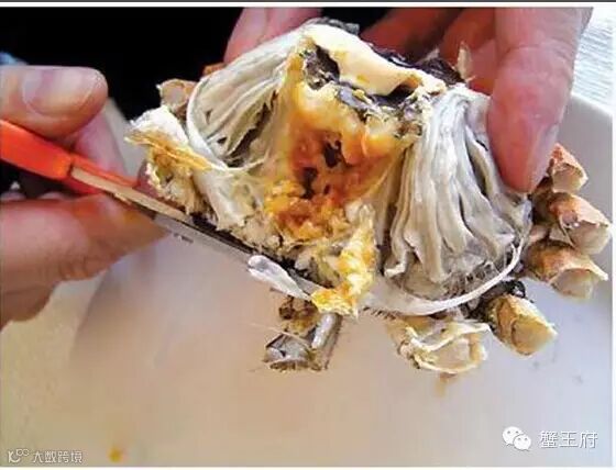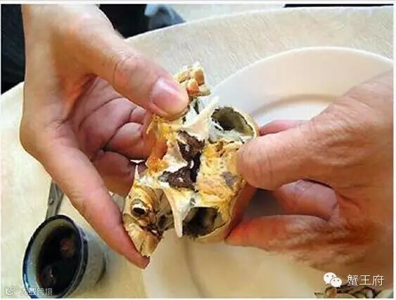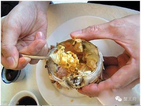 3.先吃蟹盖部分,用小勺把中间的蟹胃部分舀出,轻轻将外面包裹着的蟹黄吮干净。注意,不要吮破中间那个呈三角锥形的蟹胃,应将其丢弃