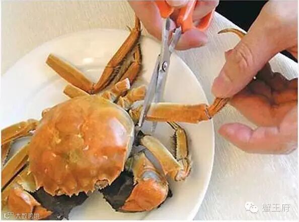 剪掉大闸蟹的八只脚,包括两只大钳,放凉后其中的肉会自动与蟹壳分开,很容易被捅出甚至是被吸出,因此要留待最后来吃。