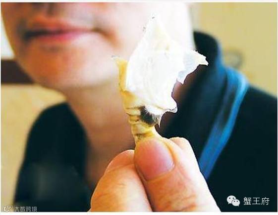 7.把蟹身掰成两半,此时可见呈丝状的蟹肉。只要顺着蟹脚来撕,就可以将蟹肉拆出。吃干净的蟹壳是完整呈半透明状的;