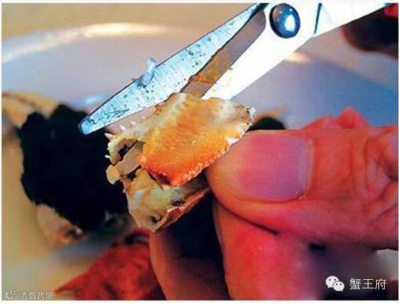 4.吃完蟹盖轮到蟹身,先用剪刀将多余的蟹脚、蟹嘴和蟹肺剪掉;