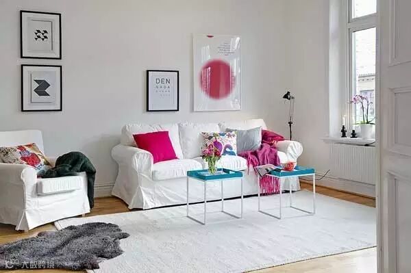 白色沙发上放一条橘色的毯子,几个桃红色的抱枕,整个客厅马上有了视觉中心。