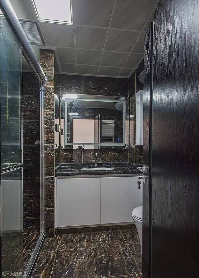 卫生间白色的橱柜设计,中和空间深色调所带来的沉闷感,利用镜子扩大了视觉面积。