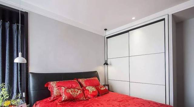 卧室房间按照主人的喜好,主要色调依然是黑白两种颜色。大大的衣柜满足两人的衣物收纳需求。