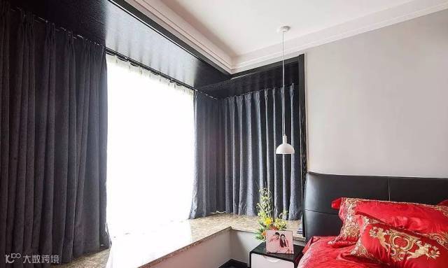 深色窗帘具备超强的遮光性,难得的周末可以美美的睡个懒觉。大面积的飘窗设计增加了休闲区域,平时在飘窗上小憩也是不错的选择。