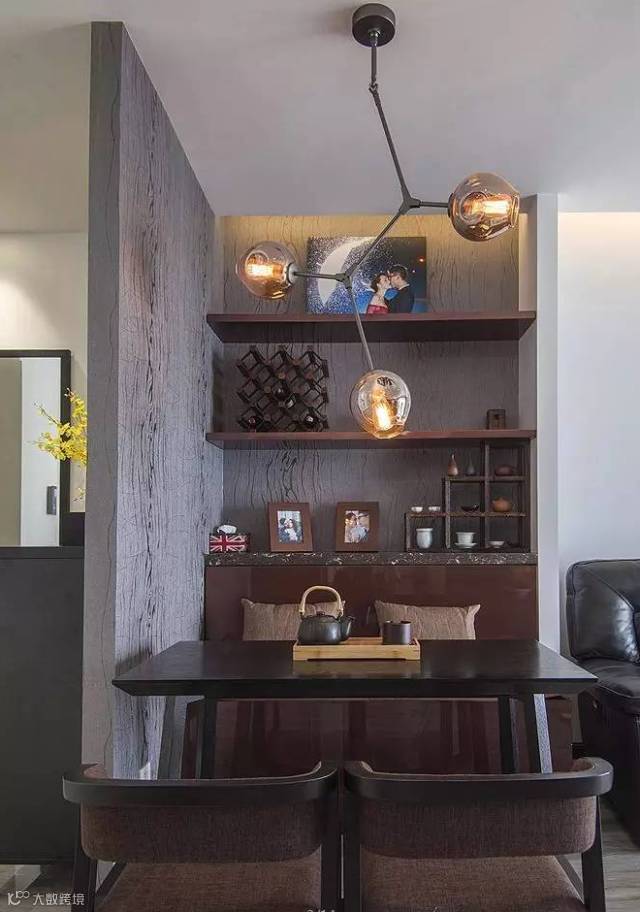 用隔断将玄关与餐厅巧妙分区,简单的空间因为有了隔断,打造了两个各具特色的功能区。卡座的设计,增加了室内的收纳,风格与客厅保持一致。