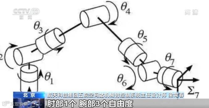 空间站核心舱机械臂是中国首个可长期在太空轨道运行的机械臂,其肩部设置了三个关节、肘部设置了一个关节、腕部设置了三个关节,一共七个关节,每个关节对应一个自由度,就如同人的手臂一般,具有七自由度的活动能力。