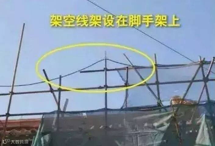 违反《施工现场临时用电安全技术规范》:架空线必须架设在专用电杆上,严禁架设在树木、脚手架及其它设施上。