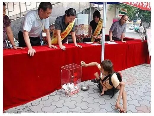 这张图片,我没有找到来源。一个残疾的乞儿,为了灾区捐款。他自己尚且是贫穷的,需要求助的,但是,苦难没有阻挡他那颗爱心。大爱无言,你就是英雄!致敬!