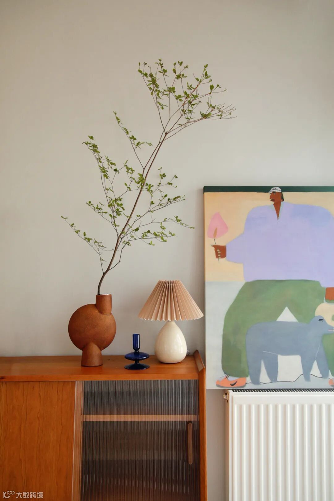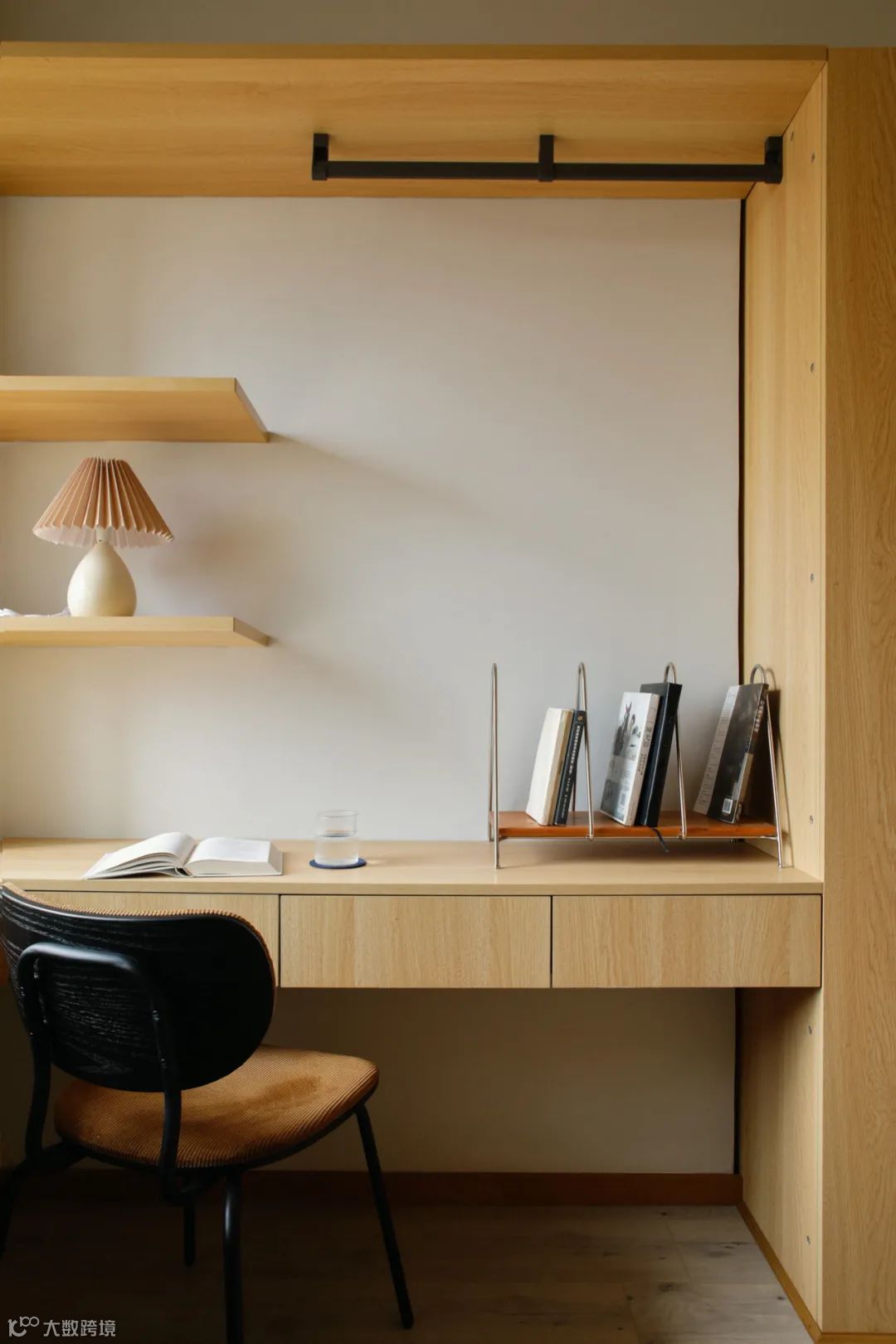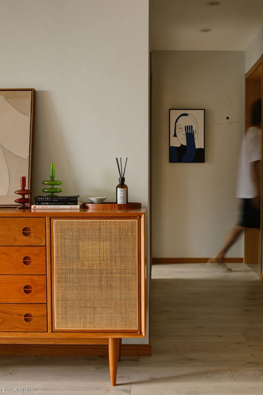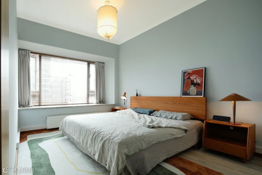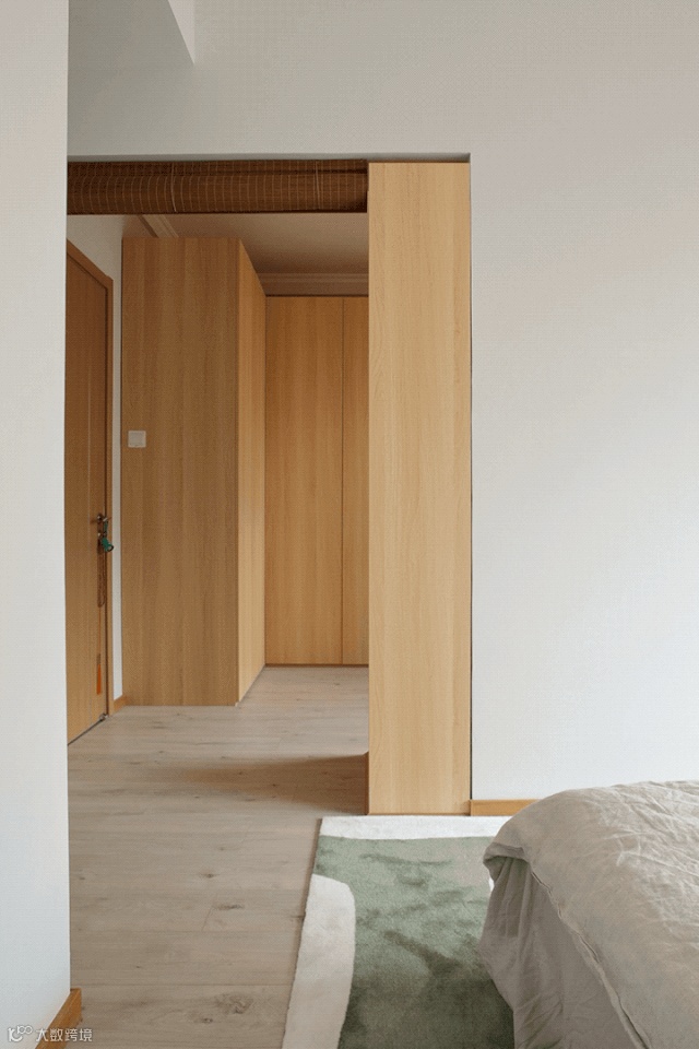 木质元素由公共空间向卧室延伸,整体格调统一和谐。过道尽头有趣的装饰画,让留白的背景不再单调。