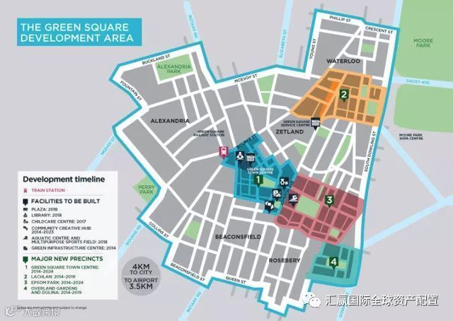 - 整个大区域以Green Square为轴心,辐射附近5个城区,包括Rosebery, Zetland, Waterloo等地区。