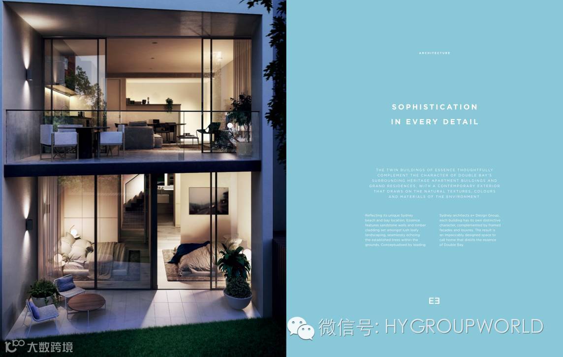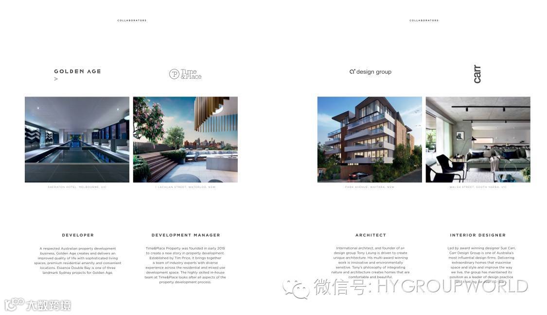 Essence由Golden Age Group打造的38套超五星精品公寓。Essence建筑设计由悉尼顶级建筑设计事务所——a+公司一手操持;室内设计部分则由澳大利亚最具影响力的室内设计公司 Carr 负责规划。乃是Double Bay 稀缺的高质量精品公寓。