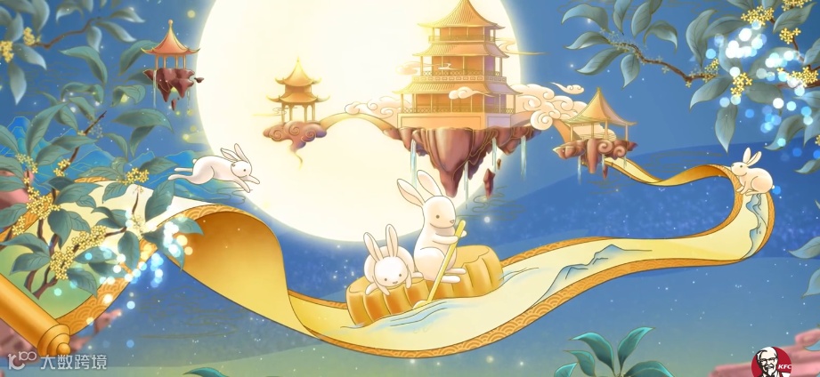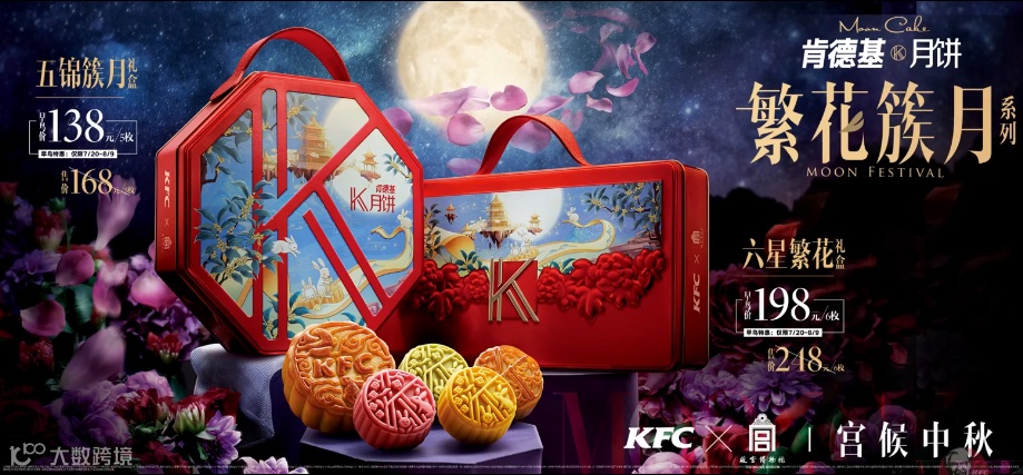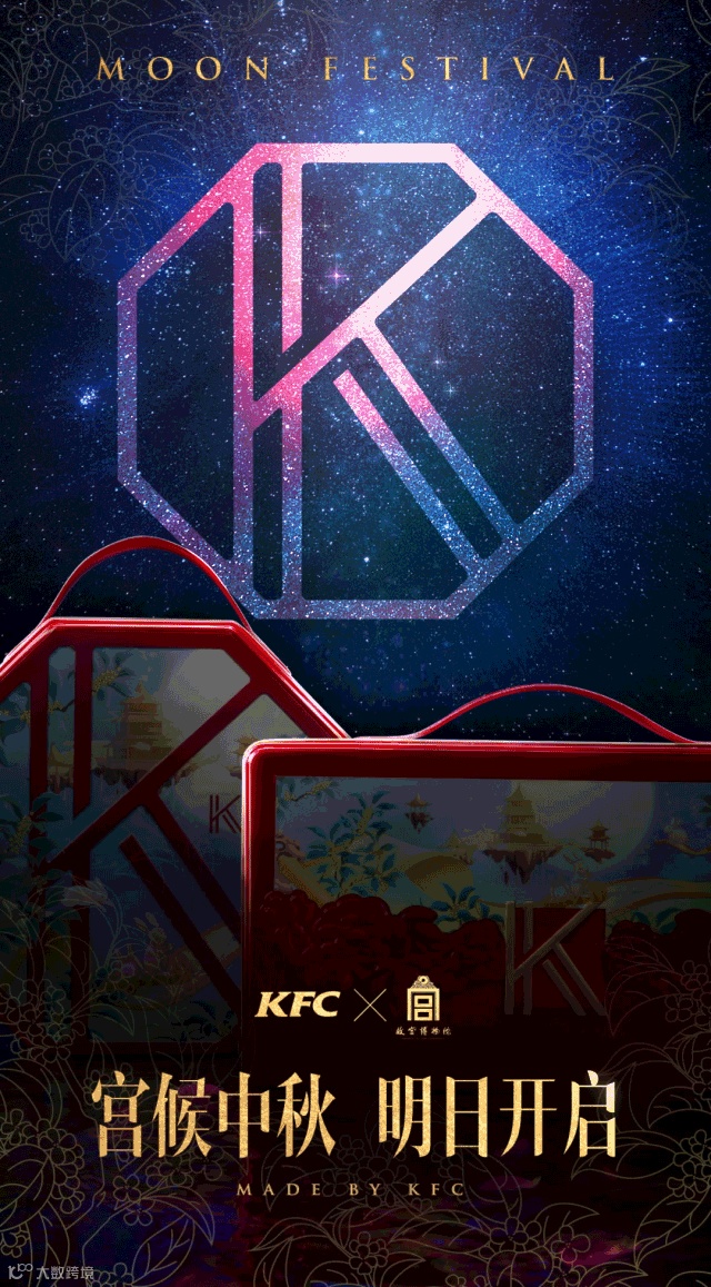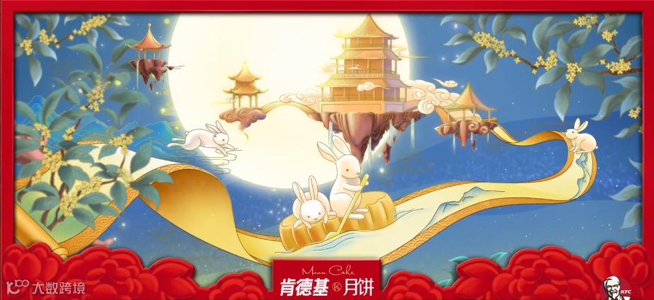 月饼包装以经典的肯德基红为底色,搭配上玉兔、天宫等浪漫奇异的中秋元素,将中式典雅与西式摩登恰到好处地组合到了一起。