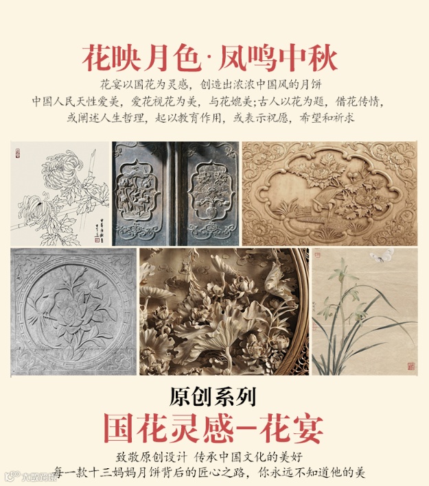 包装设计以国潮风的插画去呈现,比较有意思的是月饼的形态以花为灵感。