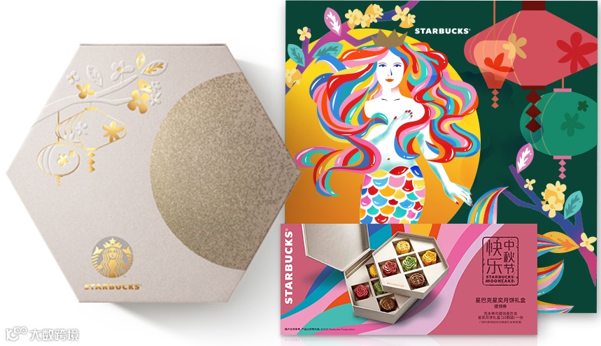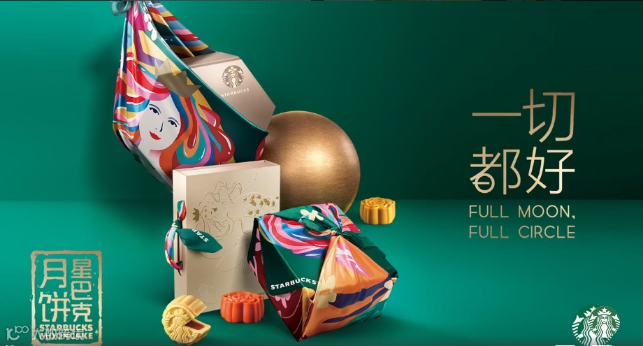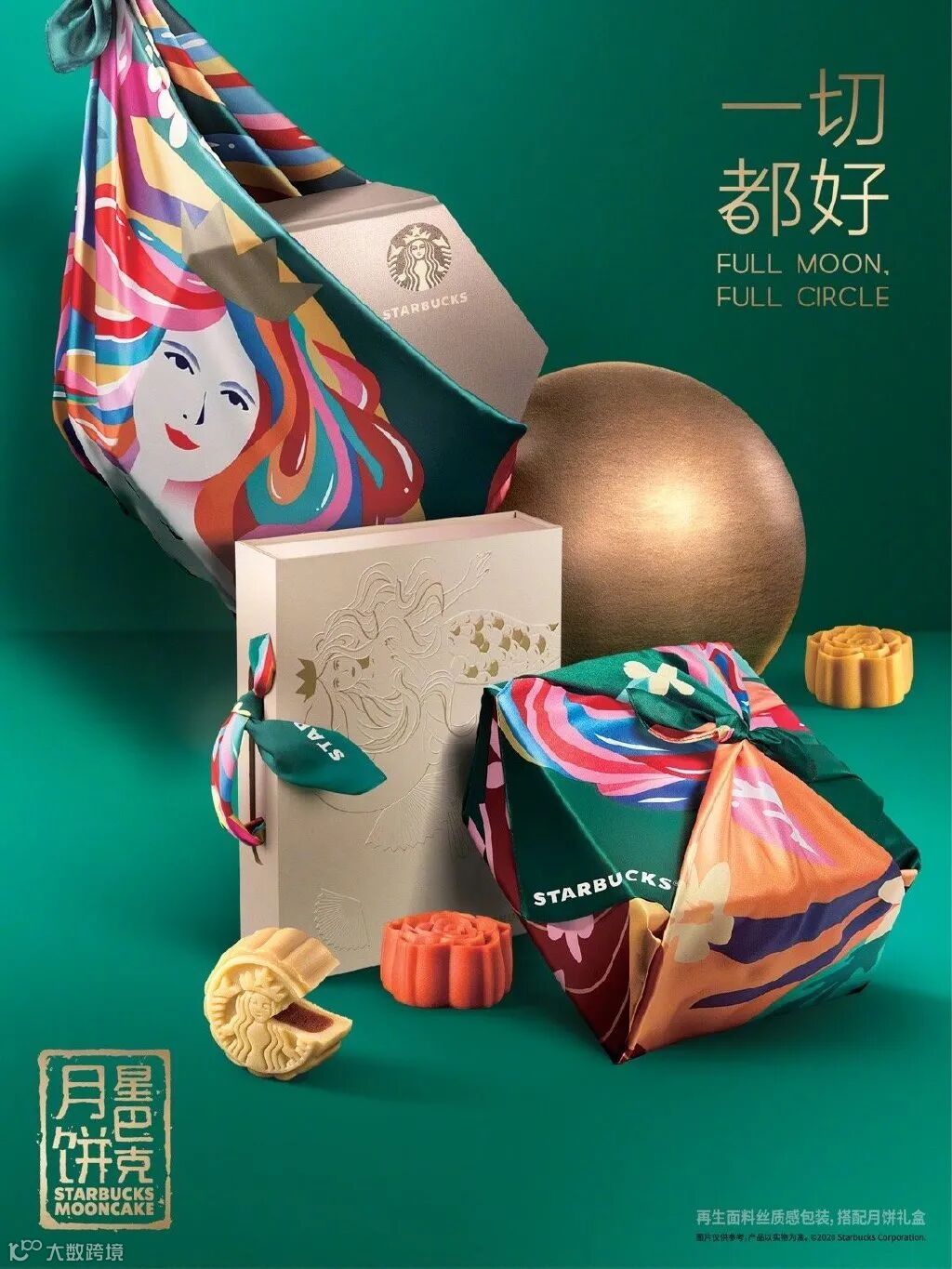 作为在中国耕耘了21的美国公司,星巴克和肯德基一样在品牌本土化上稳步耕耘,这次的美人鱼就是以中国古典神话人物嫦娥为原型。结合圆月、桂木、折扇和彩灯等中国古典元素,以多彩的颜色应用在美人鱼的尾巴和头发,这是应用在复古宝石绿大方巾上的元素。