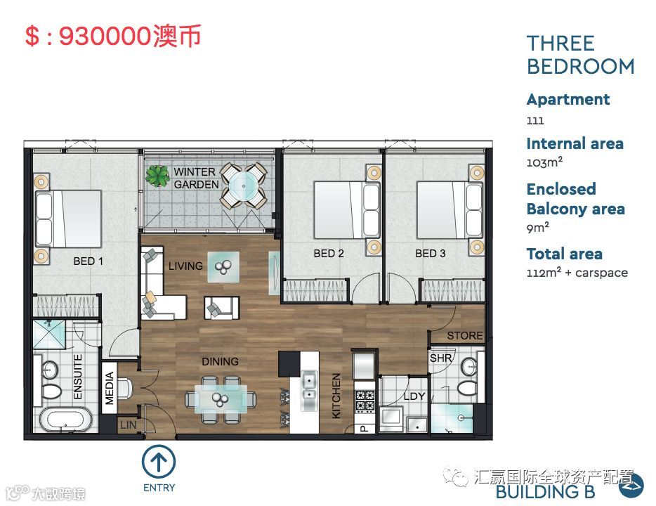 3房居家户型 92.5-94万澳币 ,面积104平米+阳台10平米 带车位