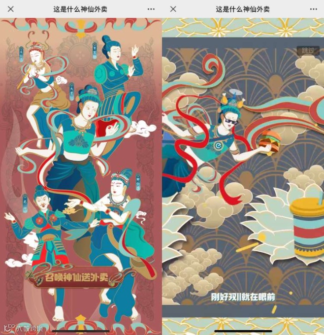 策划逻辑:进入H5后是一副手绘的彩色敦煌飞天图,点击触点,最中间的飞天女戴上墨镜背上饿了么外卖包,rap响起,动画开始播放,描绘双11券带来的各种福利,内容涵盖外卖、送花等饿了么业务。最后是“屯一次最多省一年”的落地海报,点击触点可收获福利。
