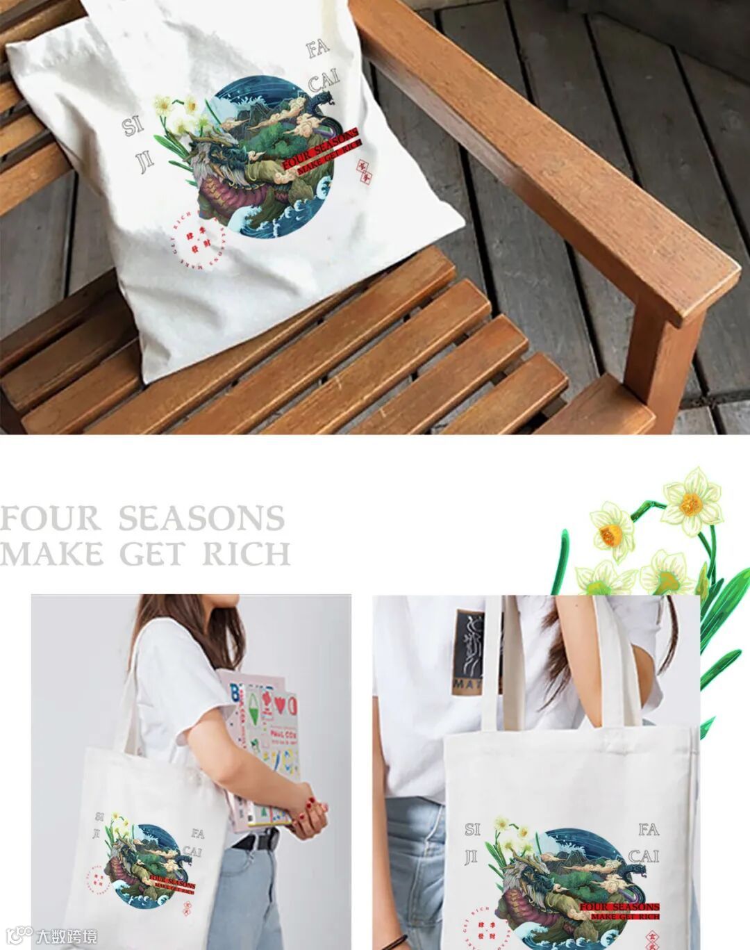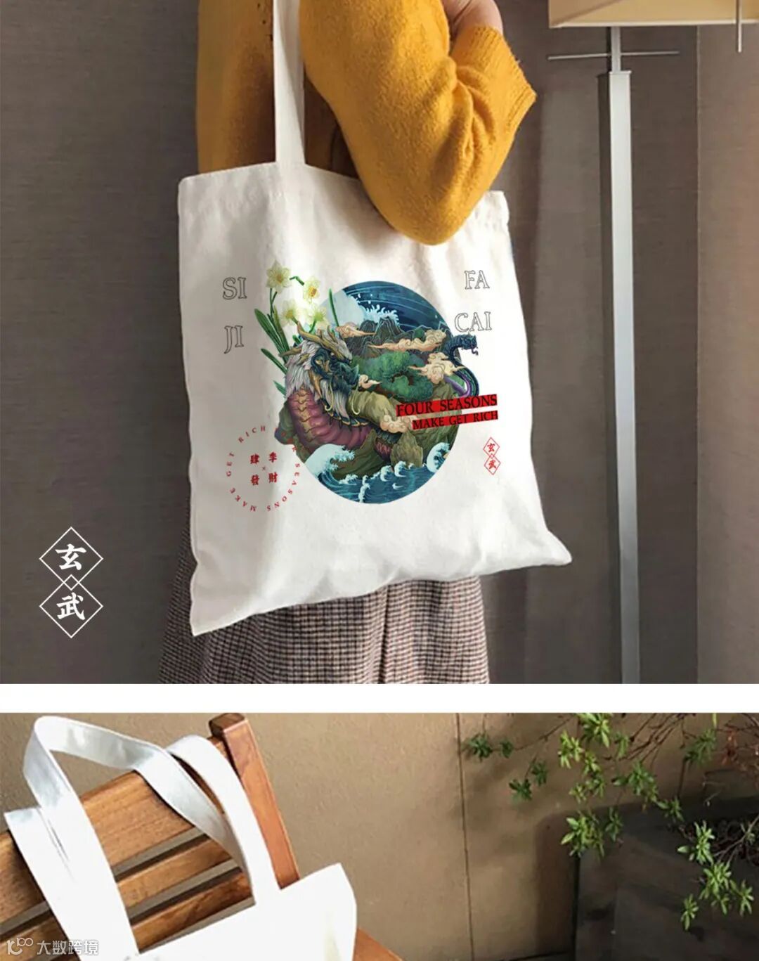 受中国传统古典神话影响,我们取《云笈七签》中记载的上古四大神兽玄武为题材,在日本浮世绘和神话及中国古代文物及建筑中找到灵感,结合时下火热“国潮风”,加些许水仙点缀,创作出了这样一款印有国风插画的帆布背包。