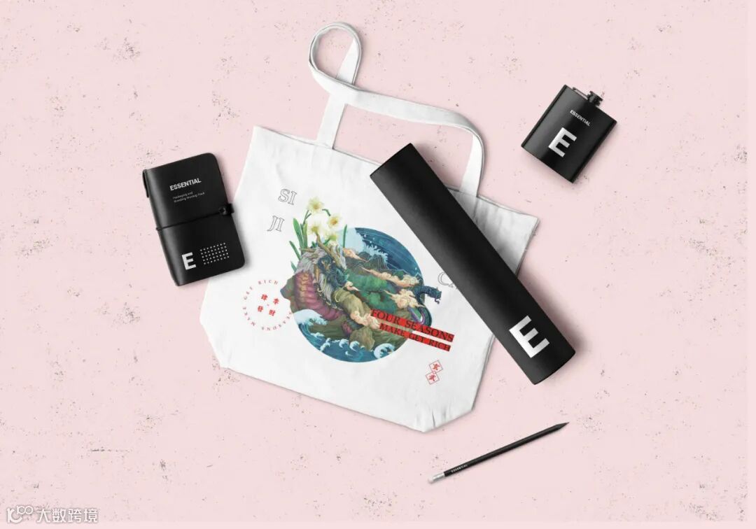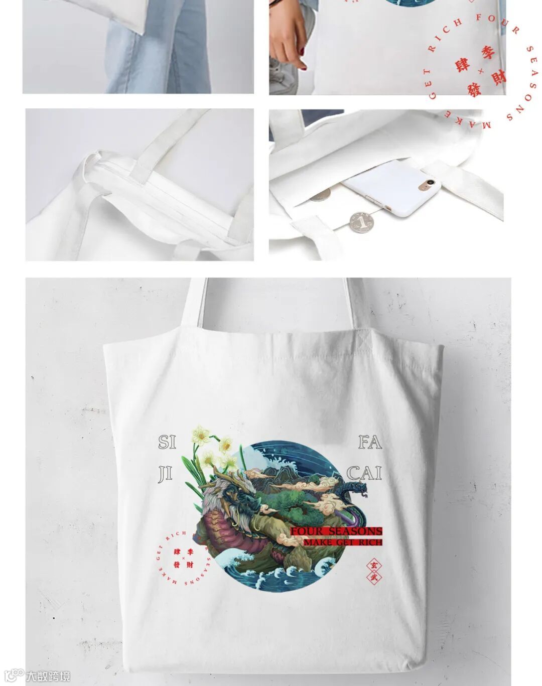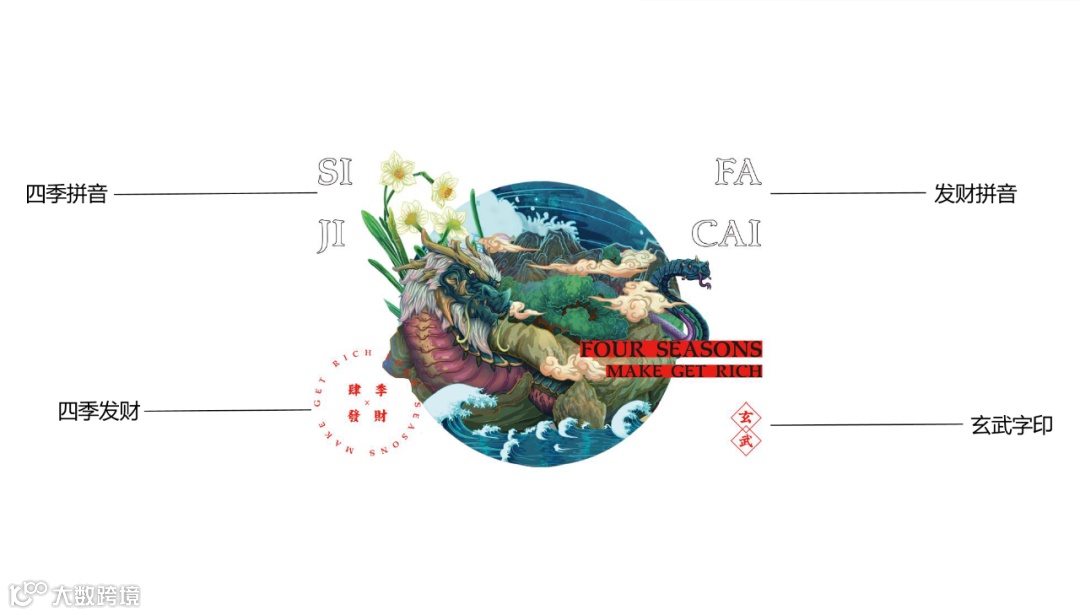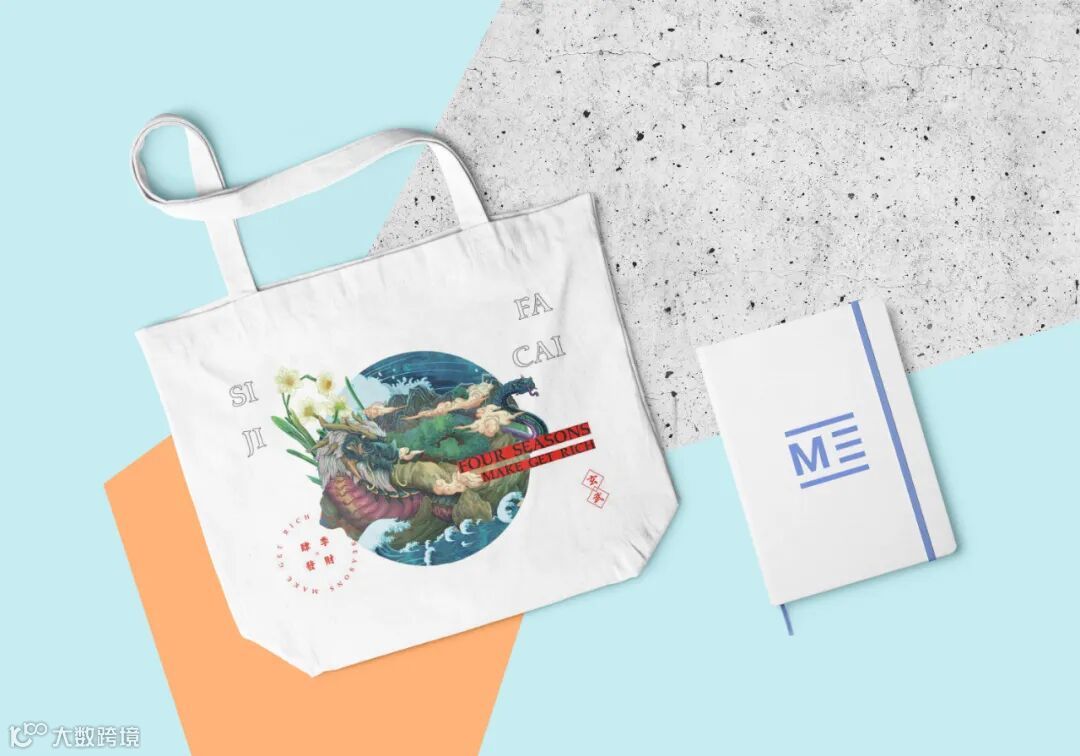 龟在传统中又有旺钱财,祥瑞平安等象征,是为“金钱归来,平安吉祥”之意。在设计上,我们在帆布包上印上“四季发财”元素为与之呼应,并印上“玄武”二字是为镇邪驱灾。