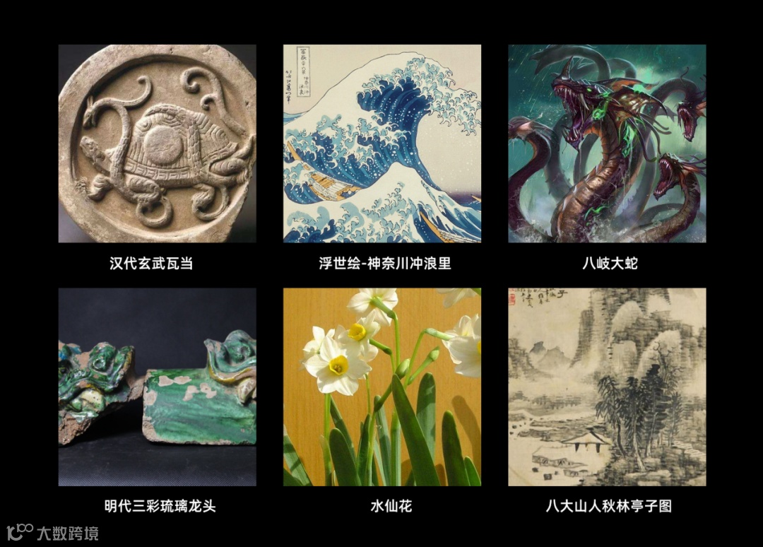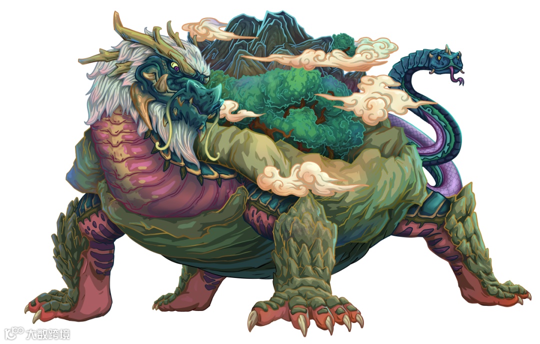 在玄武造型上,我们以明代三彩琉璃龙头和汉代玄武瓦当等古建筑元素为参考,设计了玄武形象,但总觉得龟背上的蛇身少了些许肃穆之感,在翻阅了大量资料后,我们决定参考日本神话中妖怪“八岐大蛇”,最终大功告成。