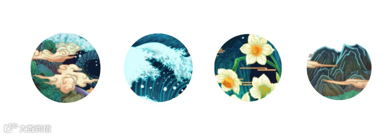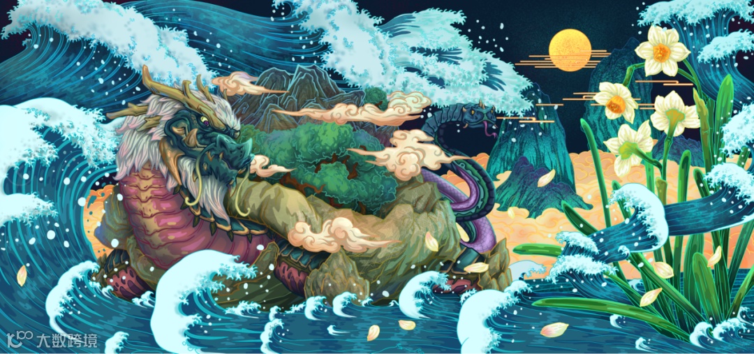 画作背景灵感来自日本浮世绘“神奈川冲浪里”,玄武至于C位,衬以巨浪体现其威严。不仅体现了上古神兽气场,其中也透露着中式古典的优雅。