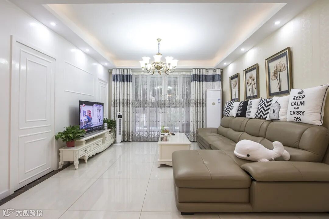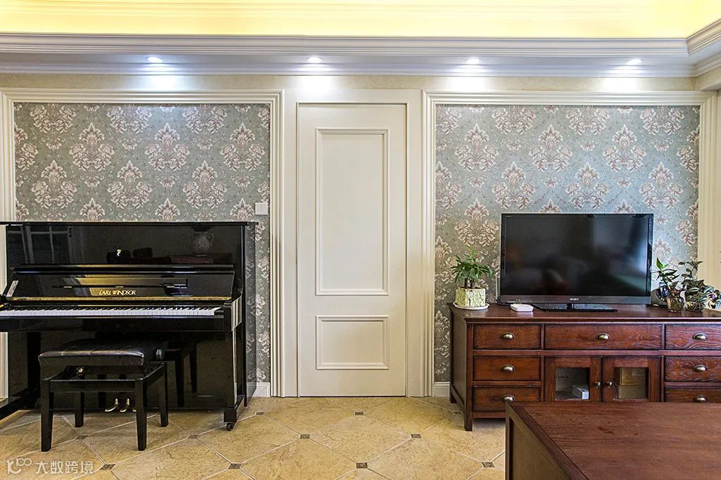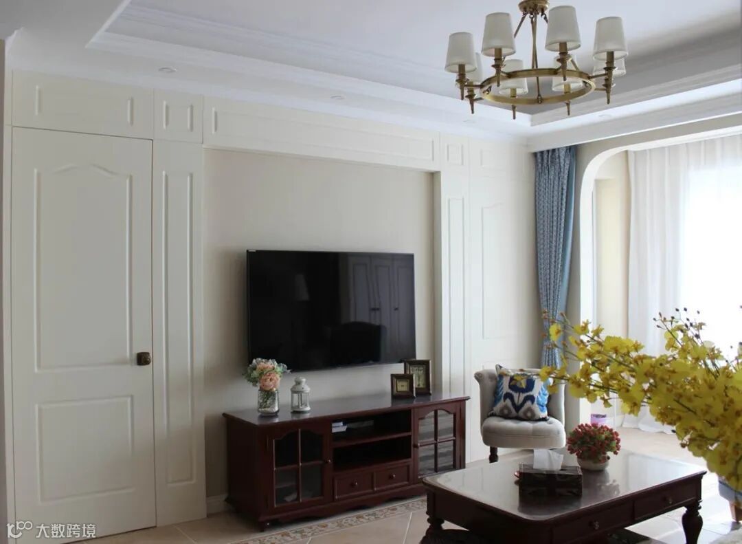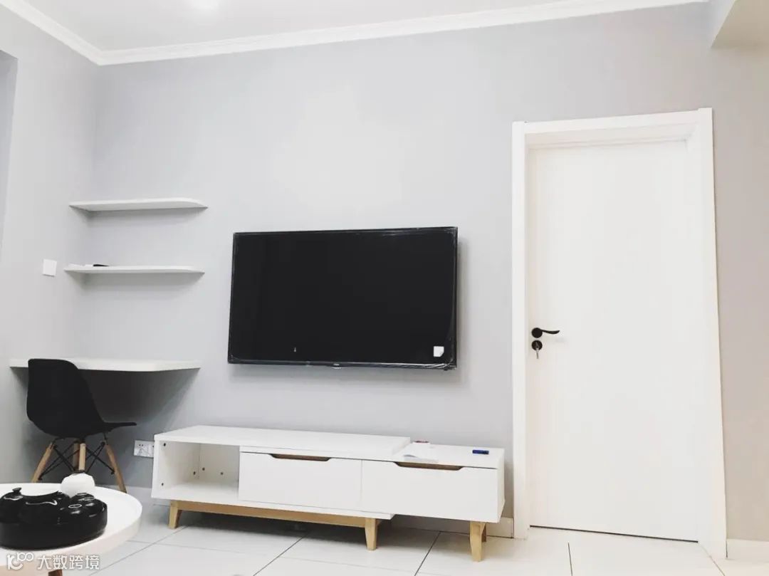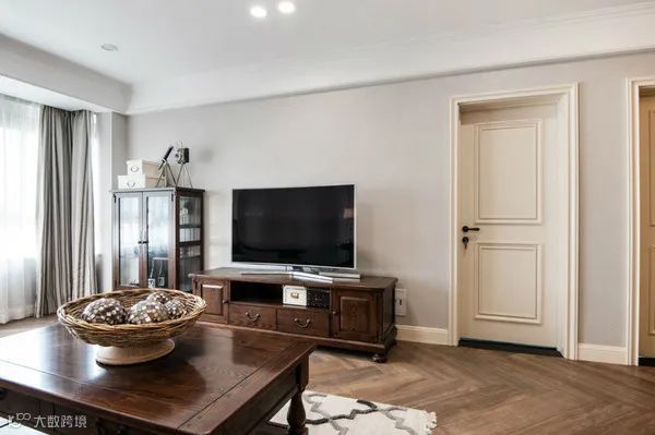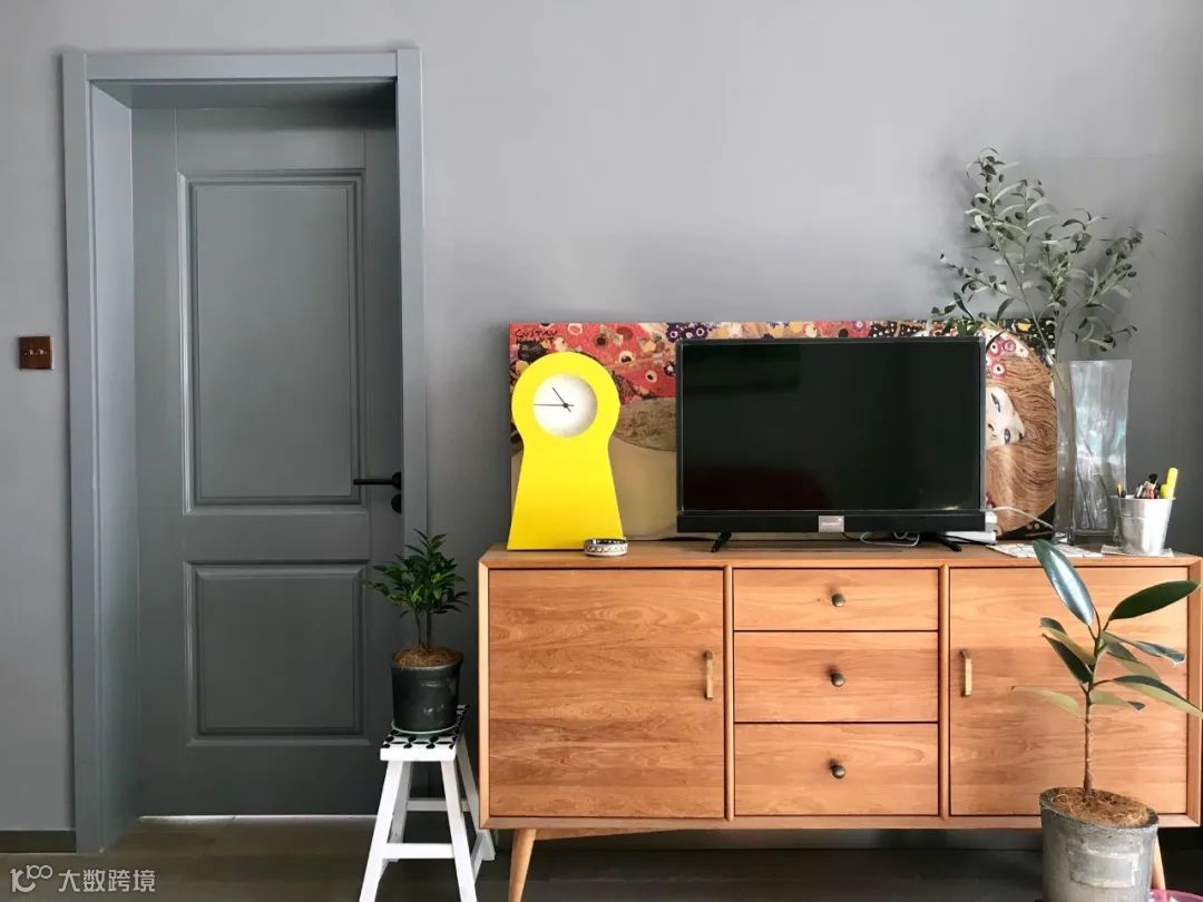 如果不喜欢边框造型的线条,就想要做个简洁点的电视墙,那么直接不做什么特殊处理,直接在电视墙上装普通自己喜欢的房门、或是跟客厅风格比较和谐搭配房门,颜色方面尽量与墙面相近,从性价比考虑来说,效果也是容易接受的。