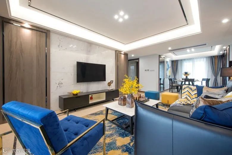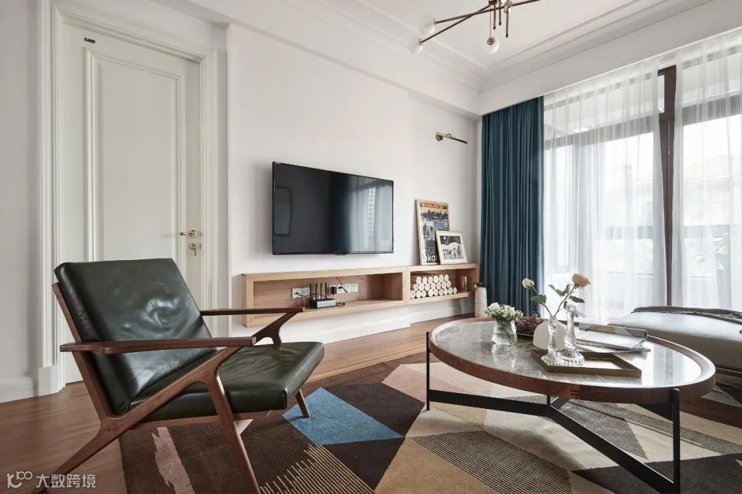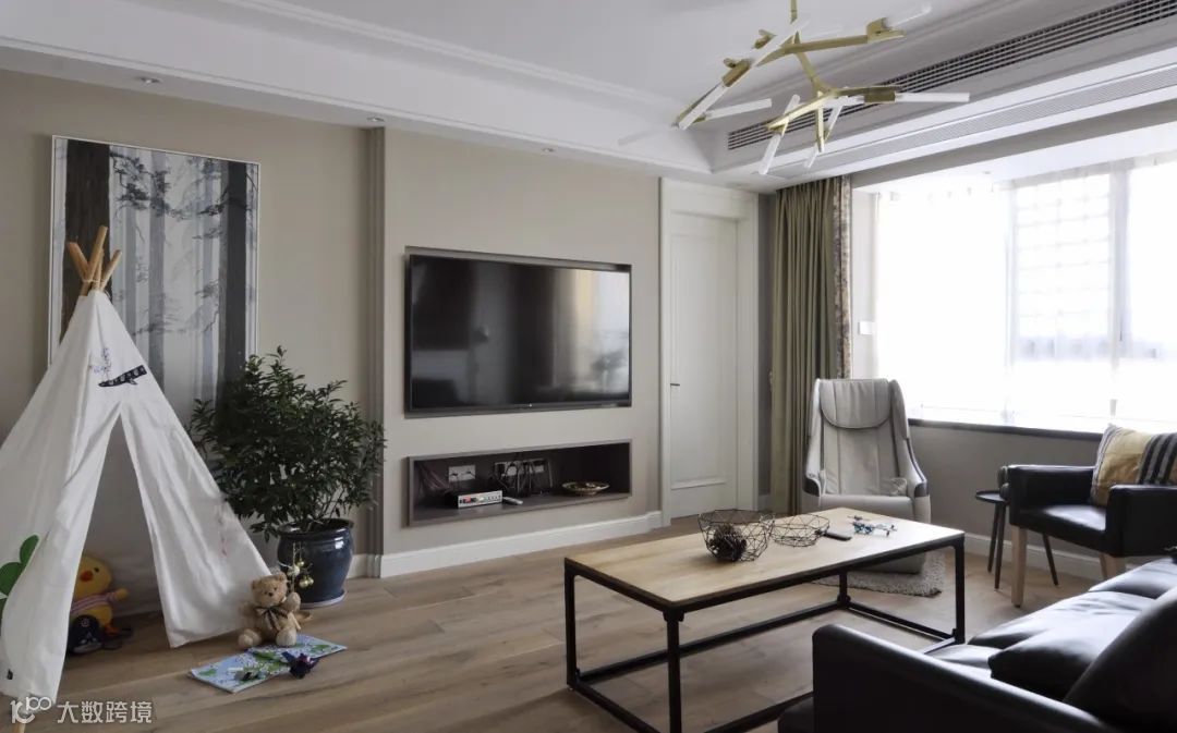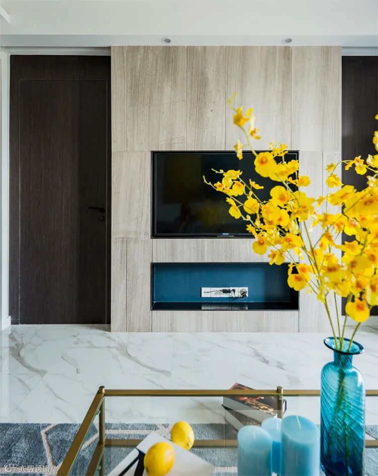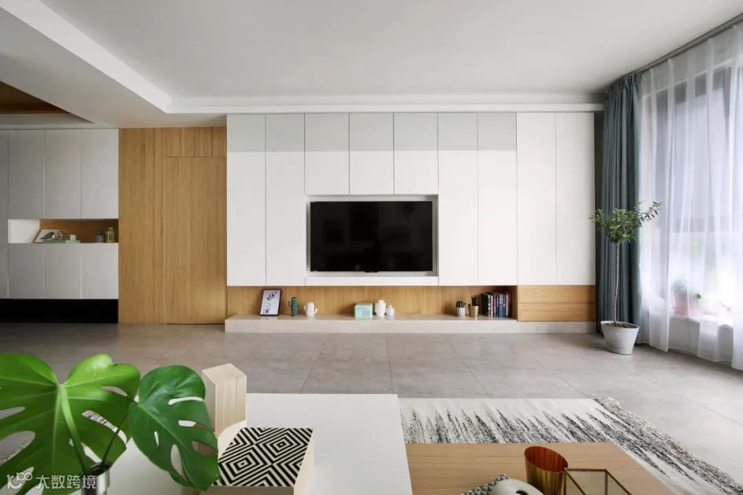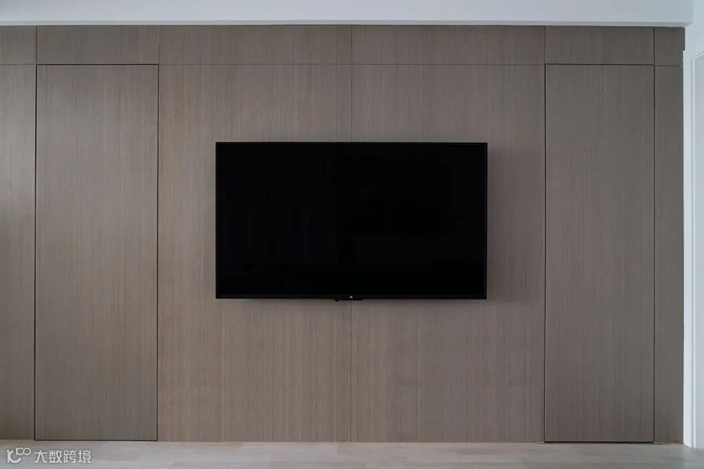 木饰面作为一种比较现代百搭的装饰元素,当电视墙上出现门洞的时候,通过在电视墙的造型搭配上木饰面,并把房门与木饰面融为一体做成隐形门,这样设计出来的电视墙,既保留了一个简洁大方的背景墙,又不会影响房门的正常功能,是一个非常精致的设计方式。